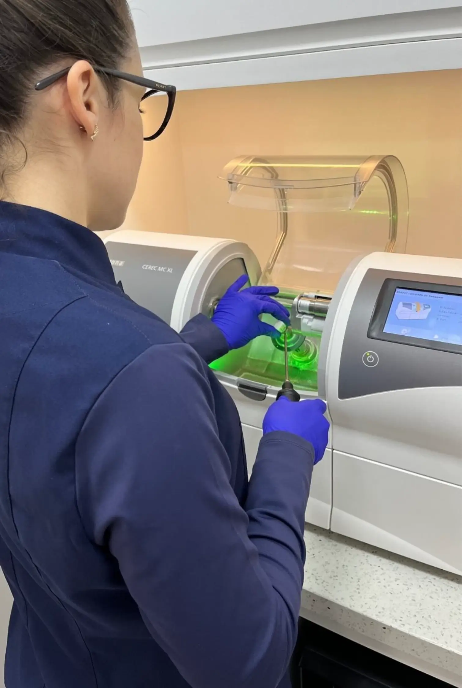 As próteses em resina e porcelana são produzidas em nosso laboratório interno, garantindo perfeita integração entre o planejamento e o resultado final. Essa conexão direta elimina erros e assegura que o produto final seja fiel ao design original, garantindo toda a qualidade que você merece, além de podermos aumentar a agilidade na entrega do tratamento.